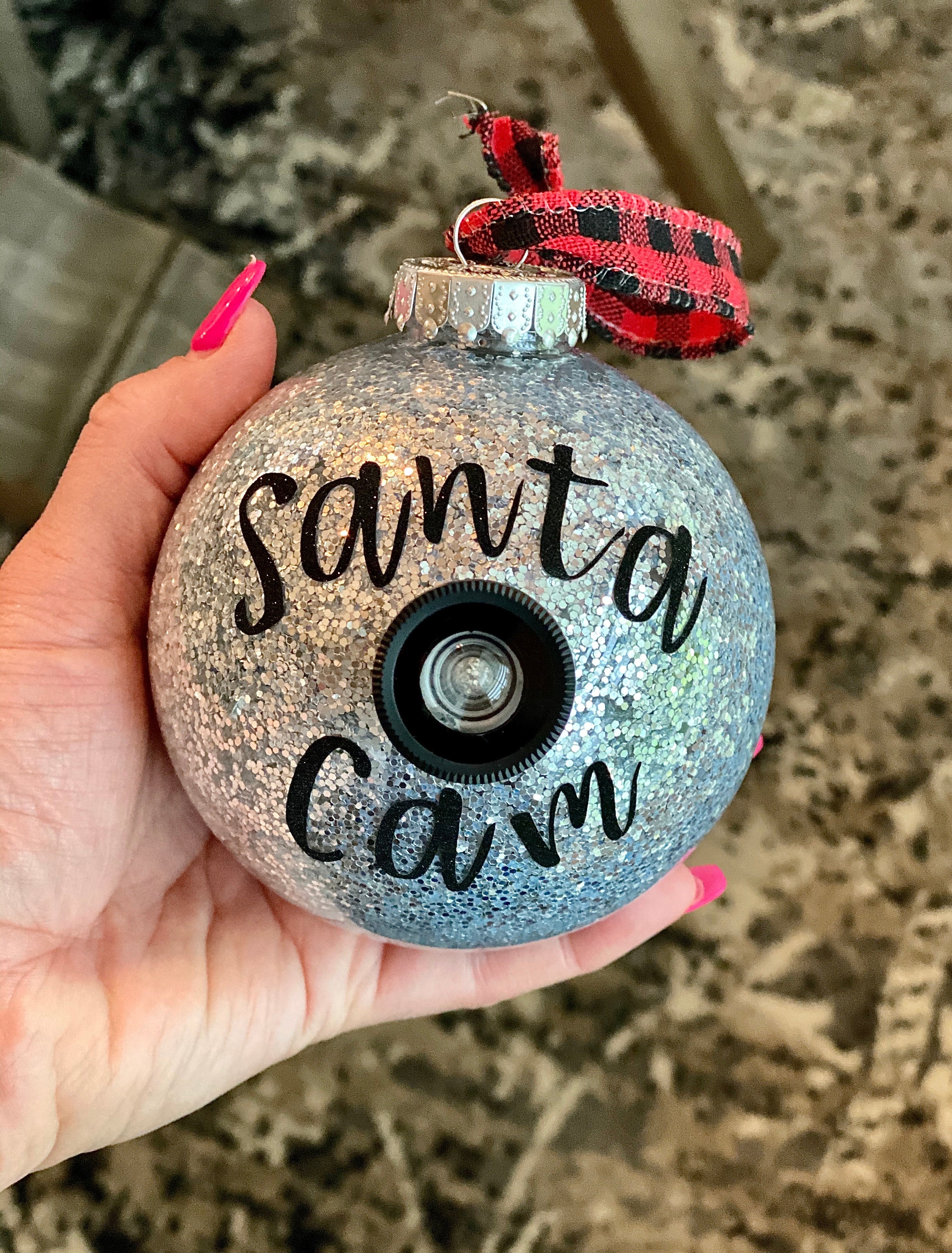 - Silver glitter ornament with red/black buffalo plaid ribbon