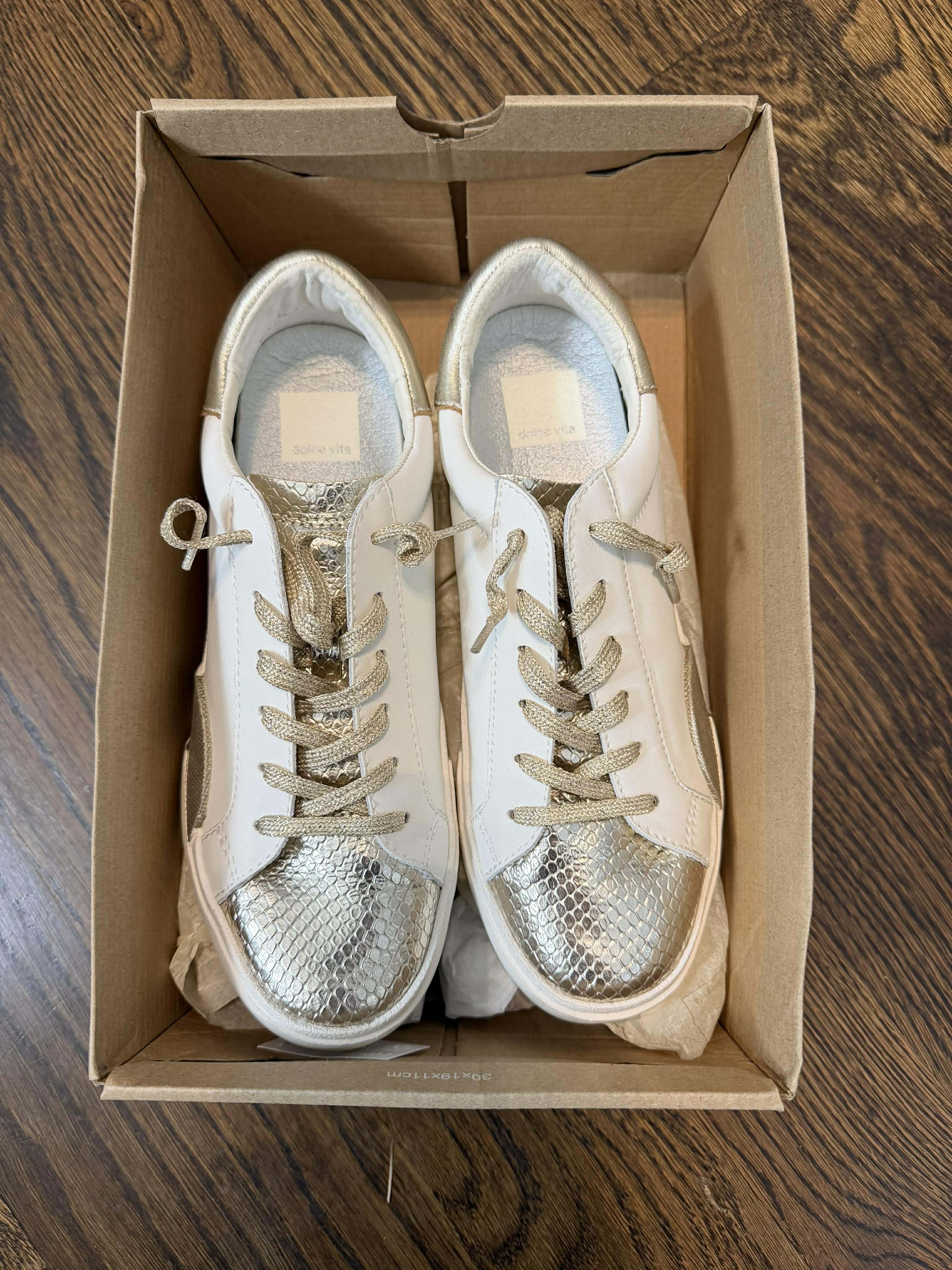 ** Colorblocked leather upper with solid, glittered or snake print panels